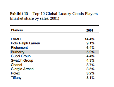 The top competitors in the apparel industry for Burberry include Chanel, Christian Dior, Ralph Lauren, Gucci, Prada, Louis Vuitton, Versace, Hermes, and Coach. Burberry falls among the top ten global luxury goods players in the world. Among the luxury good players, Burberry ranks fourth according in market share by sales based on 2001 Merrill Lynch estimates. The position of other players is presented in the table below: